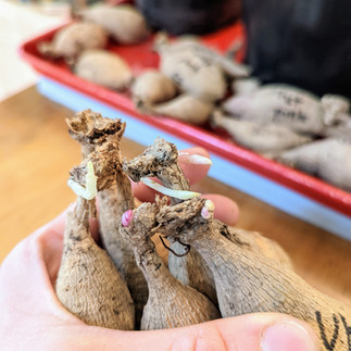 Below are tubers that have been dug up and rinsed, ready for dividing; divided tubers in a pot to begin sprouting in the spring, and baby sprouts coming from the eyes in the tubers.